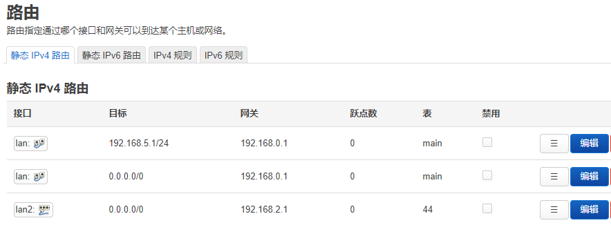 | lan2 | 0.0.0.0/0 | 192.168.2.1 | 0 | 44 |